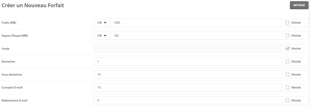Sur la nouvelle page, saisissez les valeurs souhaitées pour le nouveau package. Vous pouvez choisir des valeurs pour l’espace disque, la bande passante, le numéro d’inode, les domaines, les comptes de messagerie, les répondeurs automatiques, les bases de données MySQL, les comptes FTP, les comptes d’utilisateurs, l’accès SSL, l’accès SSH, etc.