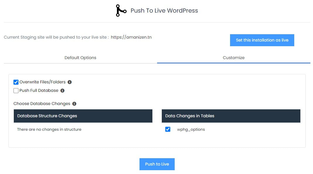 - Push par défaut : sélectionné par défaut. Cette option remplace tous les fichiers de votre installation en direct par les fichiers de l’installation intermédiaire. De plus, la base de données utilisée par la base de données en direct sera effacée et la base de données de votre installation intermédiaire y sera importée. Si cela vous convient, cliquez simplement sur le bouton « Push to Live » en bas.