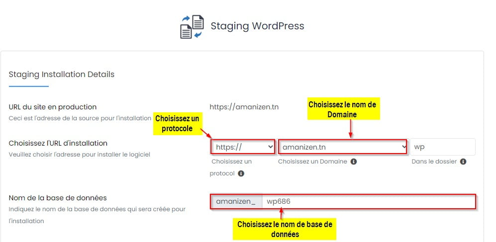 La page de création de staging apparaîtra avec les détails de l’installation en direct et un formulaire demandant des détails sur la copie de staging que vous souhaitez créer.