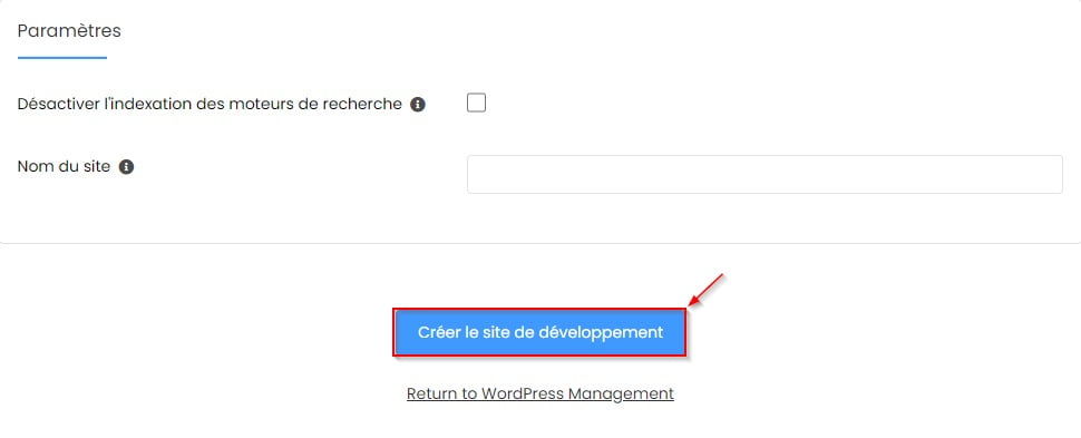 Cliquez sur le bouton Créer le site de développement et cela fera l’affaire.