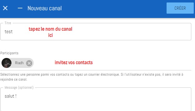 Dans le champ “Participants”, Invitez une personne ou plus parmi vos contacts ou taper un courrier électronique. Si l’utilisateur n’existe pas, il sera invité à rejoindre ce canal.