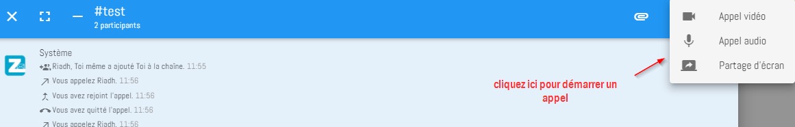 Pour démarrer un appel, ou partager l’écran cliquez sur l’icône ‘Appel’