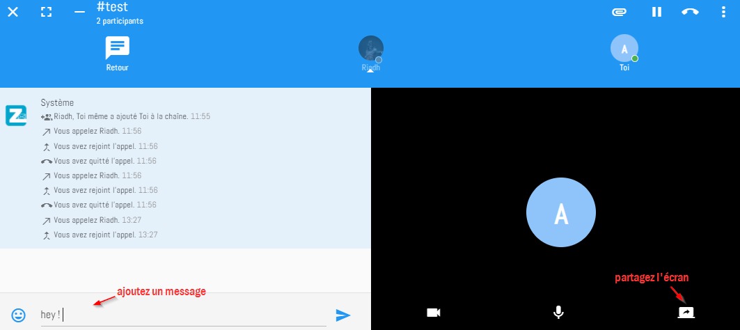 Une fois vous avez démarré un appel, vous pourrez partager l’écran, ajouter une pièce joint , ajouter un message …