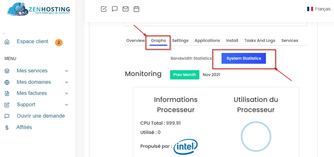 Vous serez sur la page de gestion VPS, Cliquez sur le bouton “Graphs” puis sur le bouton “System Statistics”.